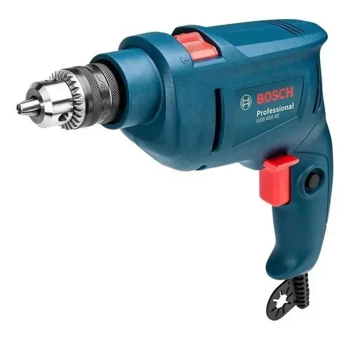 El Taladro percutor Bosch GSB 450 RE, con potencia de 450W, es una herramienta práctica y ligera, con un peso de 1,6 kg. Perfora mampostería, madera y metal, con y sin percusión, gracias al botón conmutador. Posee función de reversión y permite trabajos continuos con la ayuda del botón de bloqueo.